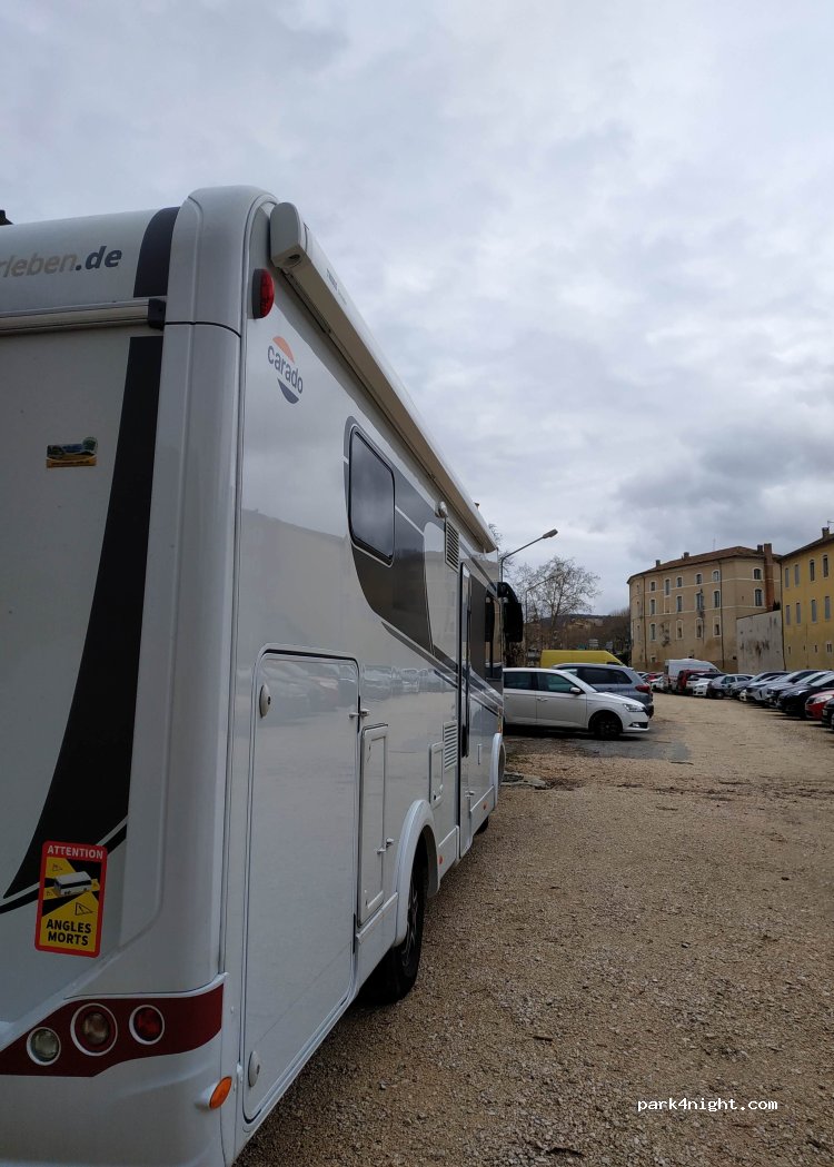 Bon emplacement même pour un CC 7,5 m sur parking de droite. virage en épingle qui nécessite une petite marche arrière pour le passer. stationnement en oblique près à repartir à cause de la longueur. Le fond du parking c est pour la poste. Bonne nuit en sécurité ( plus de dealer ). Bruyant à partir de 7h00 à cause du marché du samedi.