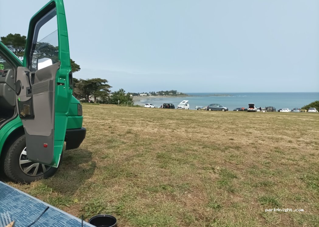 Interdit de 19h à 8h et barre à 2,10 m ! Immense parking en journée uniquement sur pelouse, avec une magnifique vue sur la mer.