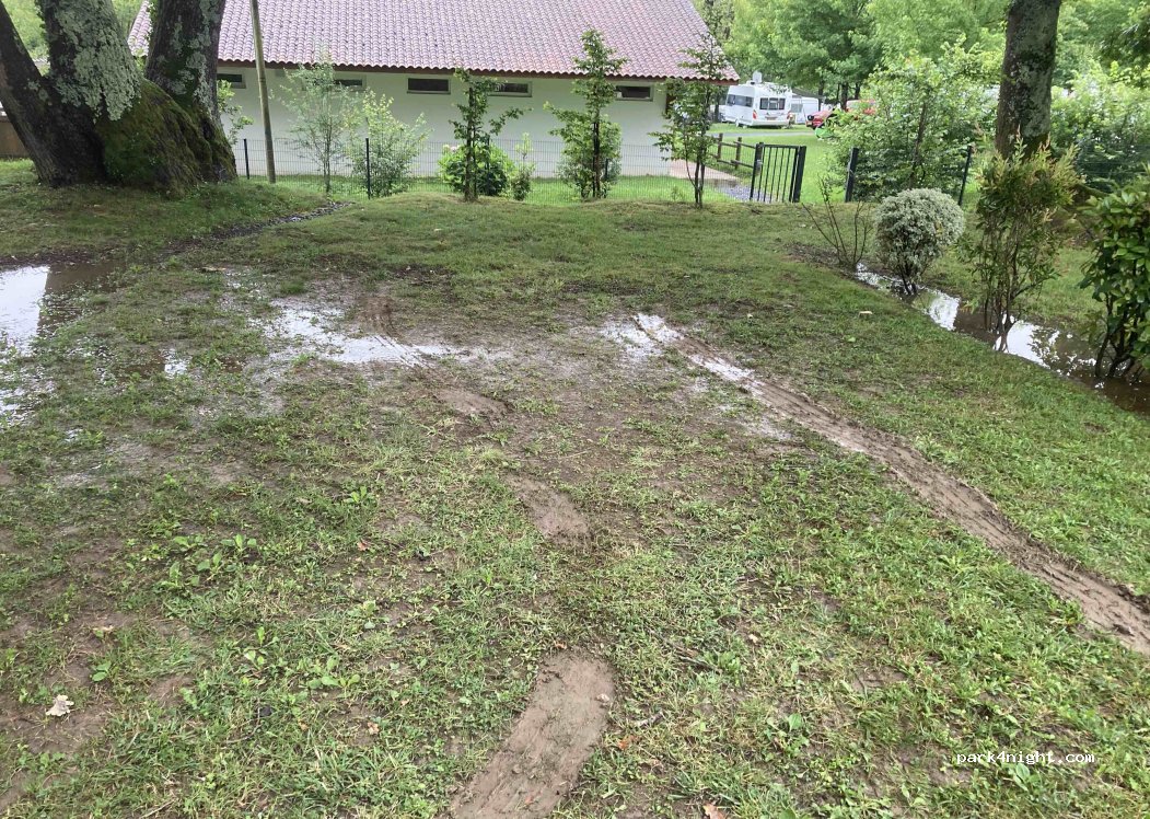 Camping Eskuaduna **** the campers are installed outside the campsite, quiet and shaded with electricity. The wedges are mandatory on grass, June 11, 2018: place on grass impractical (too wet): we are on tarmac, sloping. Everything is closed, the restaurant, the store, the pool, the shuttle to the beach. It's the same price though.