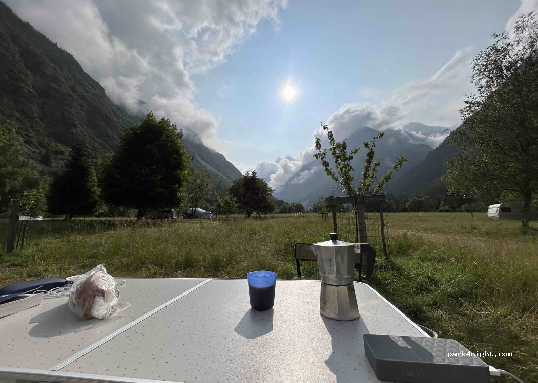 Un endroit sympa genre camping gestion libre et pas trop le choix dans la vallée . Tarif pour un van 2 adultes et 2 enfants = 25 €….donc même prix que un mauvais camping moins bien placé !