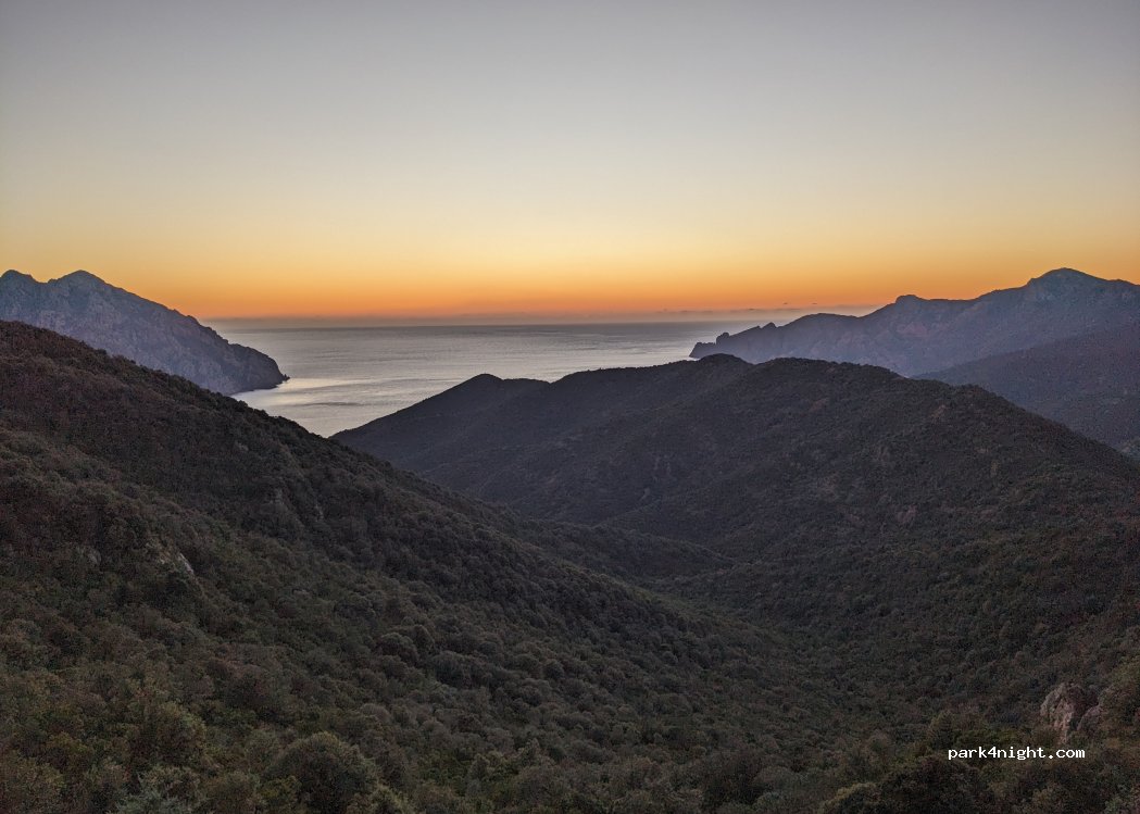 Septembre 2013. Parking en bord de route au départ du sentier pour Girolata (à environ 2h de marche avec boucle à la plage de Tuara). Coucher et lever de soleil sur Scandola.