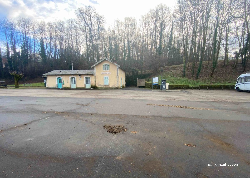 Parking au pied de la ville, bien pratique pour visiter, se balader. Sanitaires de l'ancienne gare à disposition (fatigués !). Nous n'y avons pas passé la nuit.