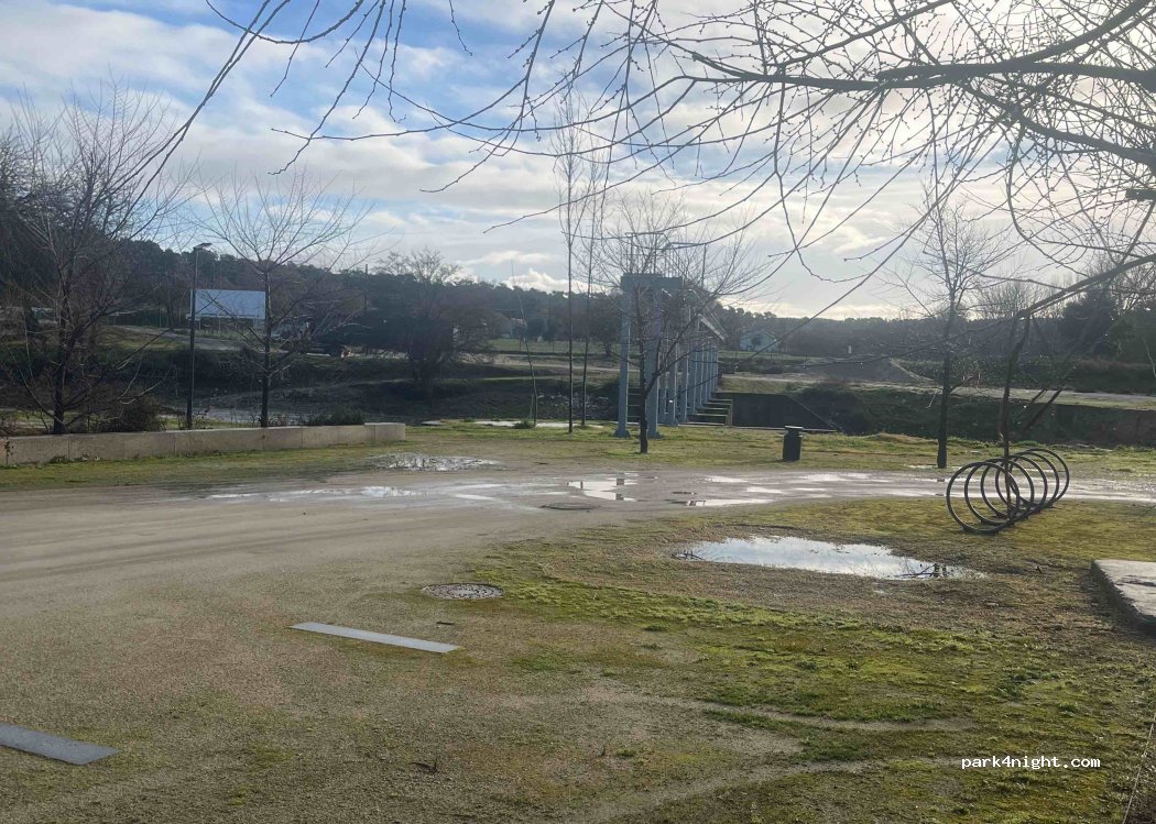 We two, 6m long campers, parked here on a Tuesday night. Stayed one night. Flat, well-lit parking lot next to the river. The silence disturbed intermittently with barking/whining from a pack of dogs and light noise from national road.