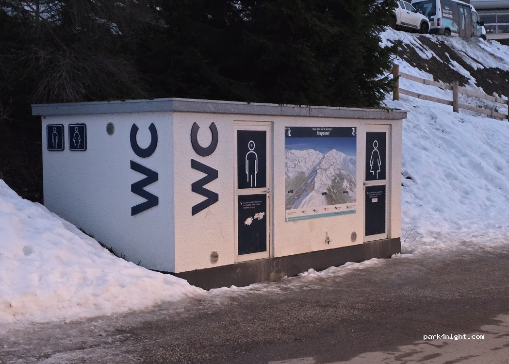 un bon parking assez plat à 100m des pistes et des commerces. des wc chauffés sont a disposition chiottes turcs et urinoirs un lavabo pour l'eau potable et un robinet cache juste en dessous pour un éventuel remplissage. il n'y a que pour les eaux grise pas de possibilité il faut dessendre au camping du col des aye pour vider et remplir. seul bemol tous les matin réveillé à 5h45 par le chasseneig