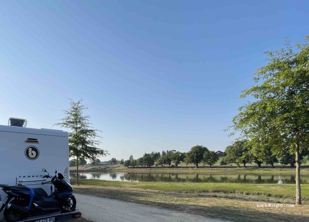 Bel espace vaste et plat face à l'étang de pêche. Adapté aux gros camping car. Attention, pas de réseau.