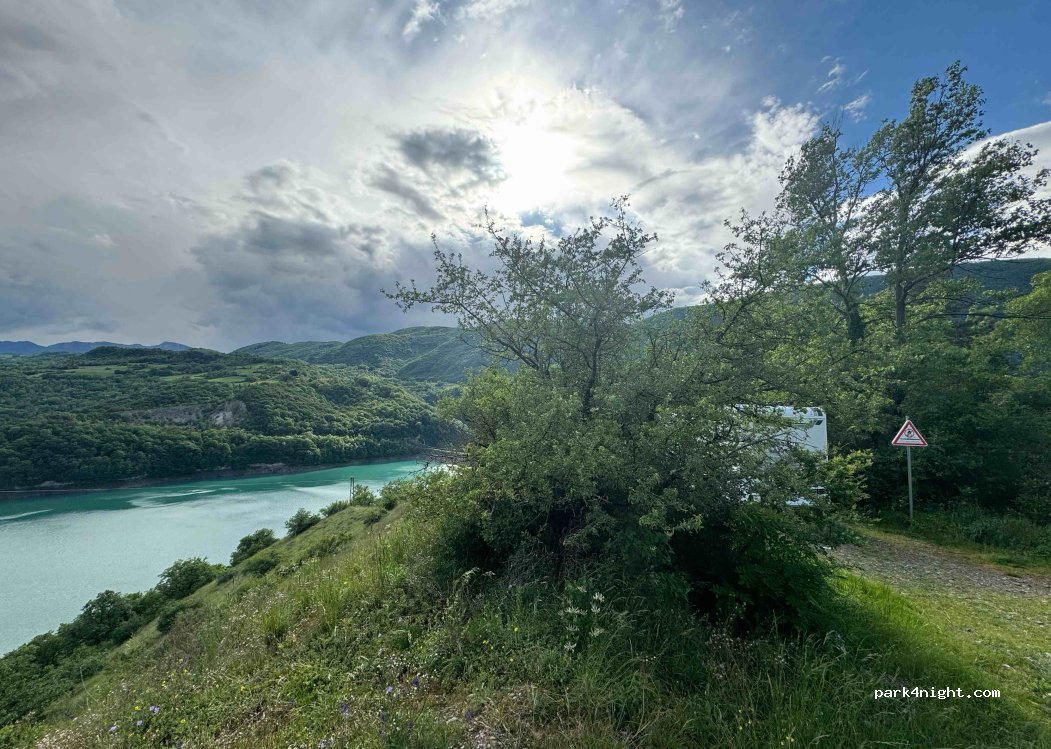 Lieu tres calme plusieurs emplacements sur la route qui descends (route sans issus) pas de passage la nuit. magnifique vu sur le lac. réseau 4g sur le haut. point d'eau dans les villages juste avant.