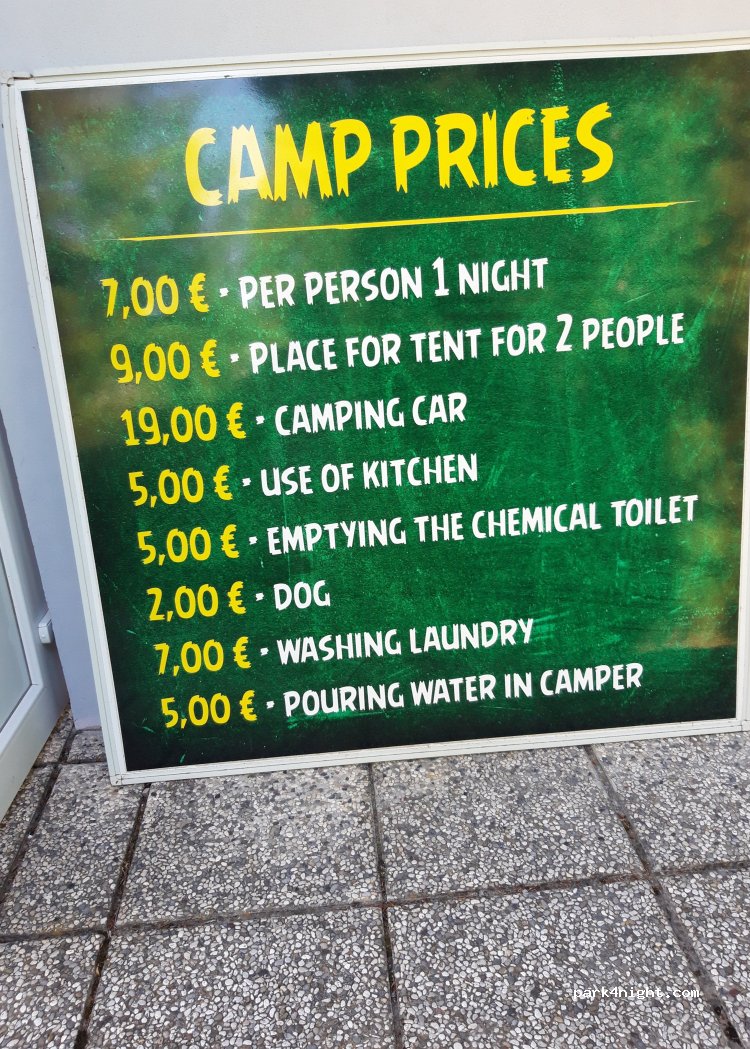 40€ for a night (2 adults + kid) on a parking place with water and electricity is rather expensive. On arrival, the owner mentioned everything available, kitchen, sanitary, chem. toilet disposal etc. What he forgot to say is that except for sanitary, you have to pay for the rest (see prices services) … that sounds greedy!! Alas no other place to stay overnight in the area…