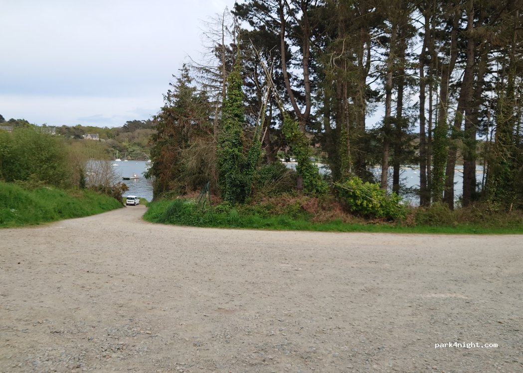 Un parking qui n'est effectivement pas plat mais avec une cale de roue il n'y a pas de problème. Sur le parking du bas il y a un petit sentier (circuit pointe de Barnenez) à gauche de la descente qui part dans la forêt je vous invite à le prendre et le continuer jusqu'à une pointe qui est à peu près à un petit kilomètre et là vous aurez une vue imprenable