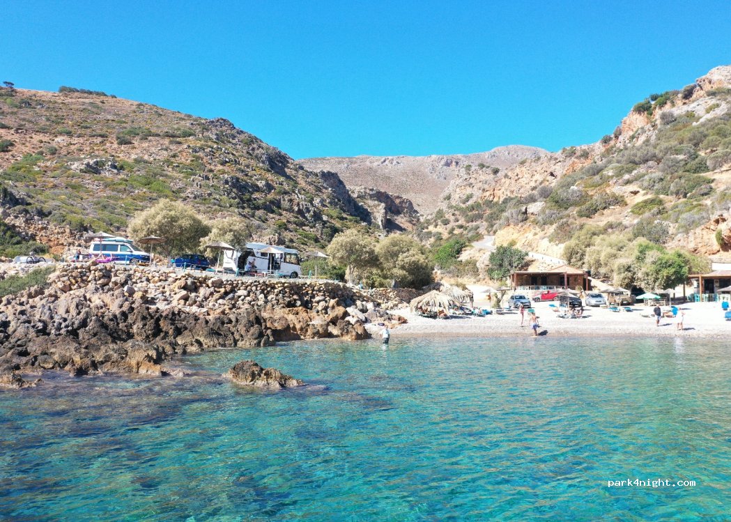 Wir standen 3 Nächte hier, ganz alleine; Ruhe, Sonne und Meer. Zufahrt mit 8m Länge, 2,50m Breite und 3,60m Höhe kein Problem. Allrad nicht erforderlich. Unbedingt in die Taverne im Ort besuchen, super Essen und Service, es lohnt sich.