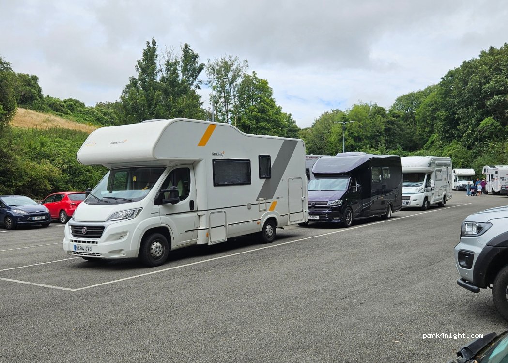 Very large car park with a coach park there space 4 about 15 motorhomes but be aware that it’s used by the public as well it gets quite crowded in the evening so a lot of motorhomes get there early from around 2 o’clock also be aware that the place comes alive at about 730am in the morning when the coaches start to move away, but in general, we had a quiet night from about 10 in the evening.