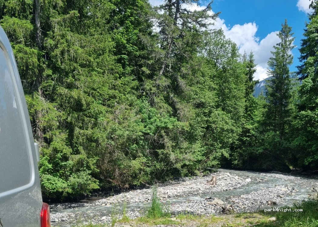 très bon spot, bruit de la rivière apaisant et coin ombragé. Pas mal de randonneurs sur le chemin mais absolument pas gênant. Lac de Javen à 20min parfait pour les baignades par journée ensoleillée. accessible avec mon camion de 7m de long. de l'espace pour manœuvrer, je recommande cependant attention en cas de fortes pluies/orages l'eau peu rapidement monter