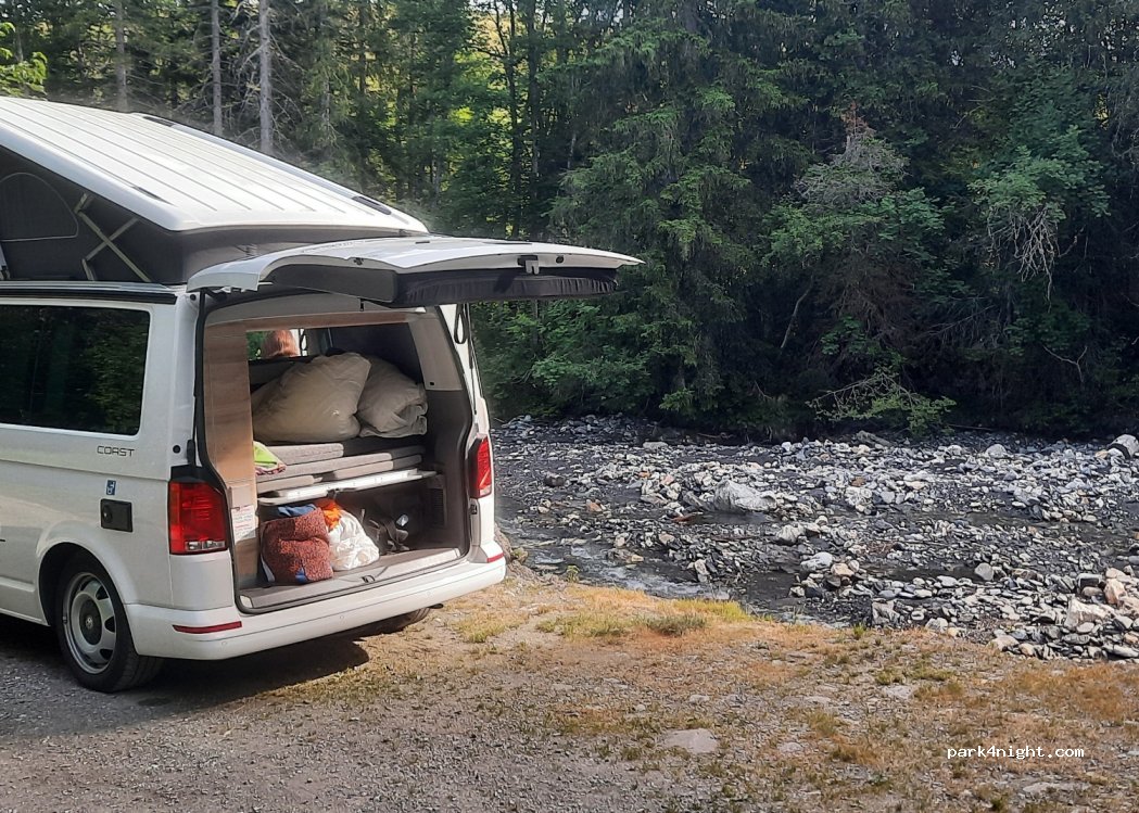 Très sympa pour une nuit en fourgon. Pas de limite de hauteur. Voitures arrivent tôt le matin (départ de rando)