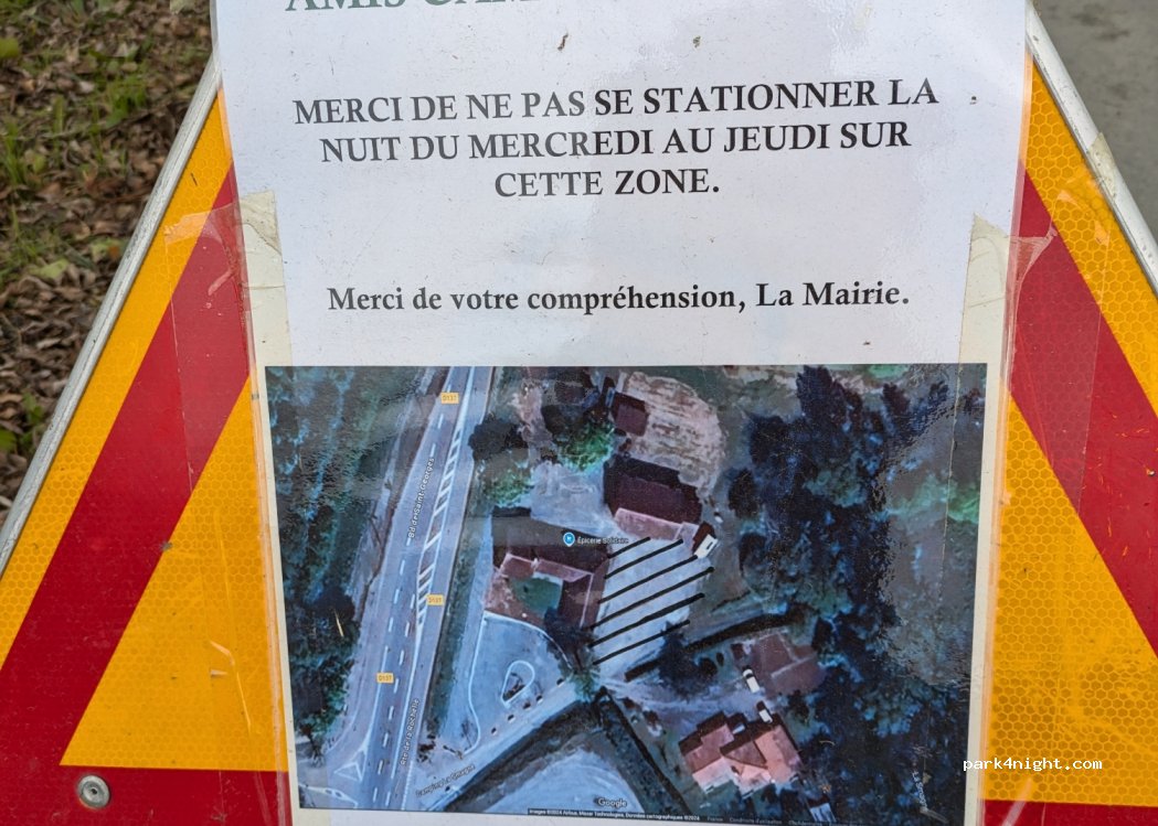 Appréciable de pouvoir se poser là et bénéficier des services. Petit coin de verdure et cours d'eau en prime. ATTENTION stationnement interdit les nuits de mercredi à jeudi. Merci à la commune.