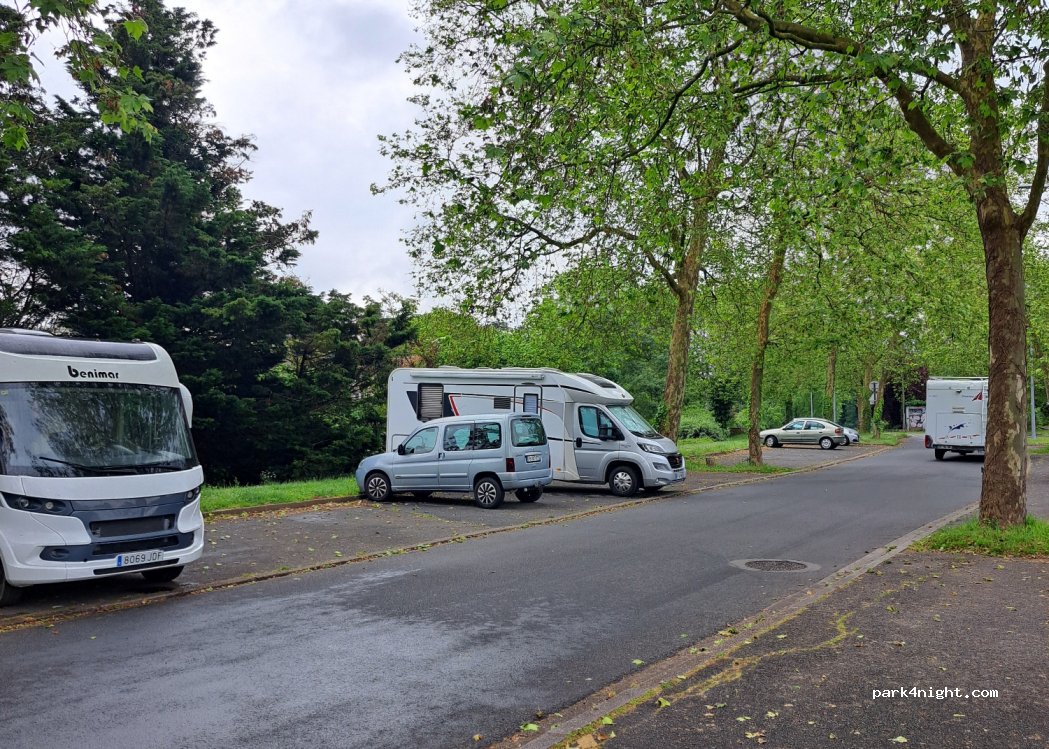 Des places en nombre oui, mais pas pour un CC de 7 mètres avec vélos ! Je me suis placé en parallèle de la rue et ça ne gêne pas, peu de voitures actuellement. Du passage en soirée, voire très tard et le matin dès 6 heures l’aéroport pas loin… et les employés municipaux à 8 heures ! Bon, c’est la ville ! Coin très verdoyant, facile pour promener le chien ou faire du jogging.