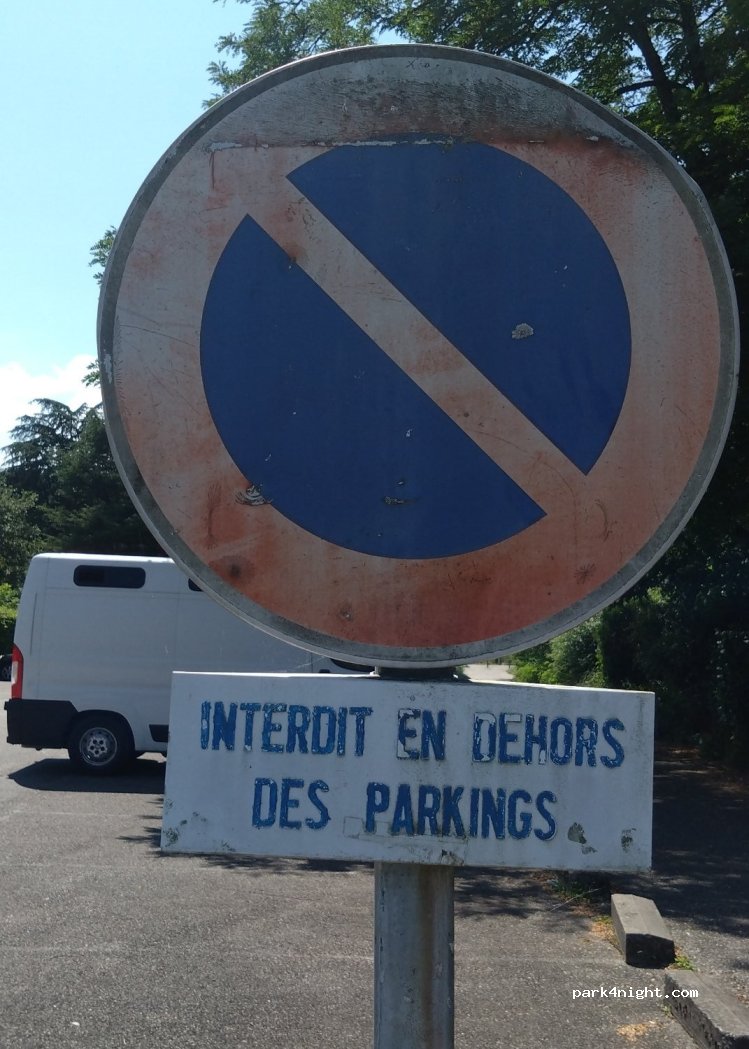 Parking d'un parc, attention proche banlieue. Accès étroit, stationnement en épis pour Vans, long 6 m maxi. Pont limitant l'accès à 3m.