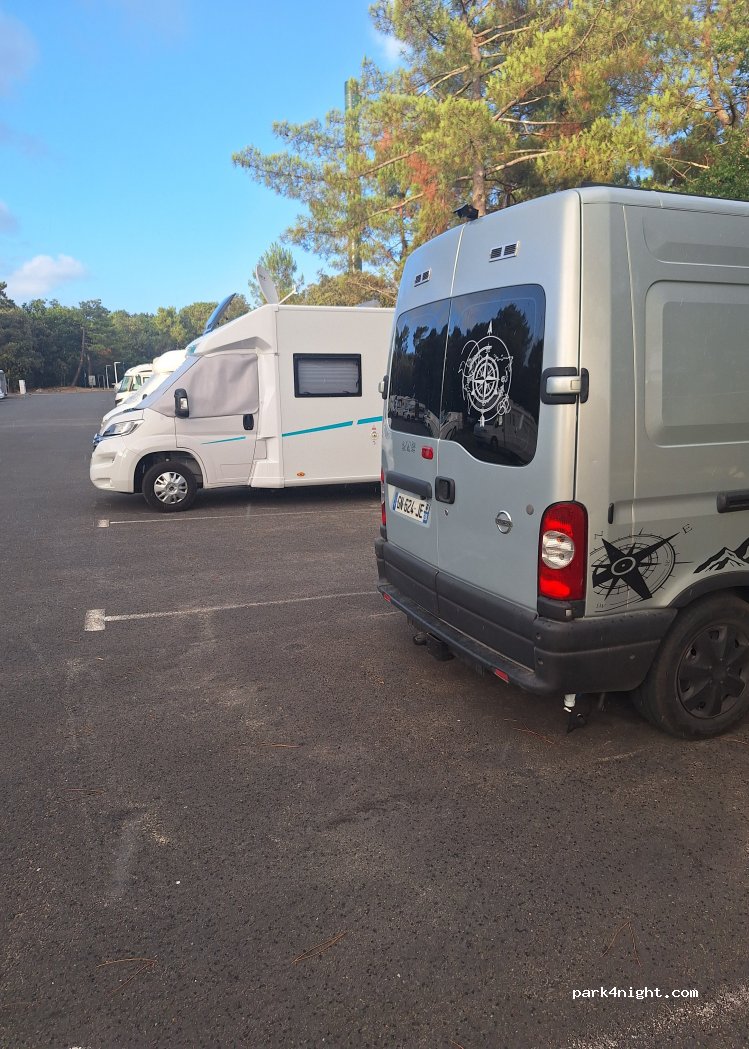 Une aire sacrifiée sur l'autel de la rentabilité, 45 places sur cette superficie, on ne peut pas faire mieux cela la transforme en parking avec services. La réservation est guère incontournable tellement il y a du monde, cela fait les choux gras pour Camping-car Park. Prévoir les vélos pour profiter de la piste cyclable de la forêt de la courbre et ses belles plages.
