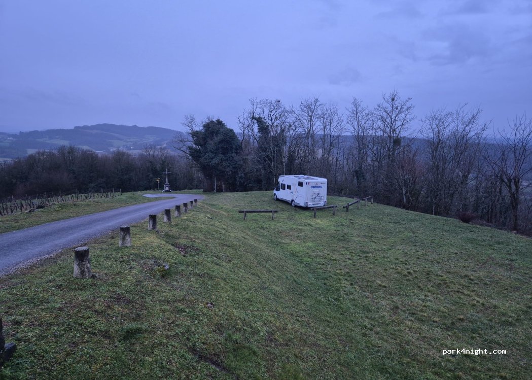 Stationnement gratuit pour la nuit au calme avec belle vue et table panoramique. Peu de passage parking en herbe et plat. Signale comme parking pour une association de chasseurs
