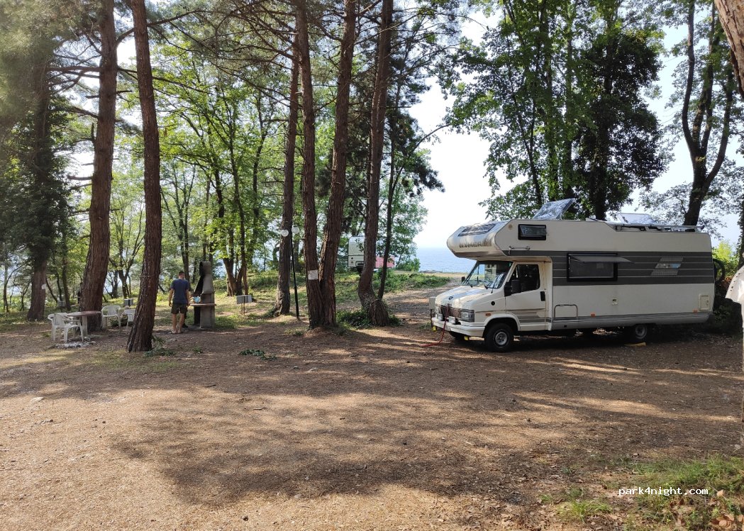Nice place under pine trees. Just 150m to the beach. There are services like electricity, water, WC, Shower etc. The owner is municipality and asks 80TL for one night for caravans.(2022)