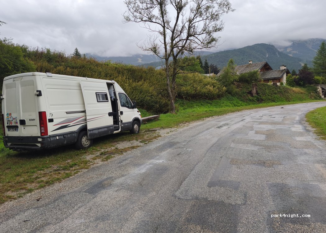 Flat sites along the road. The road is without exit therefore very little transient. Quiet night. Sun in the morning. Nice view of the Flycatcher and the mountain range. Good location if you want to avoid parking stations because not too much choice on Corrençons. Water supply (tap) near children's playground in the village.