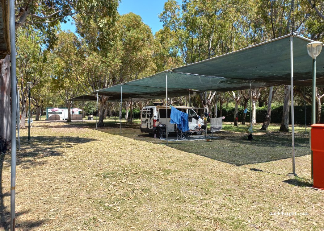 Grand camping au bord de la mer. Les campings car de passage sont placés près de la plage. Pas d arbres mais de grandes tenture pour protéger du soleil. 25€ la nuit tout compris. Restaurant dans le camping et musique le samedi soir.
