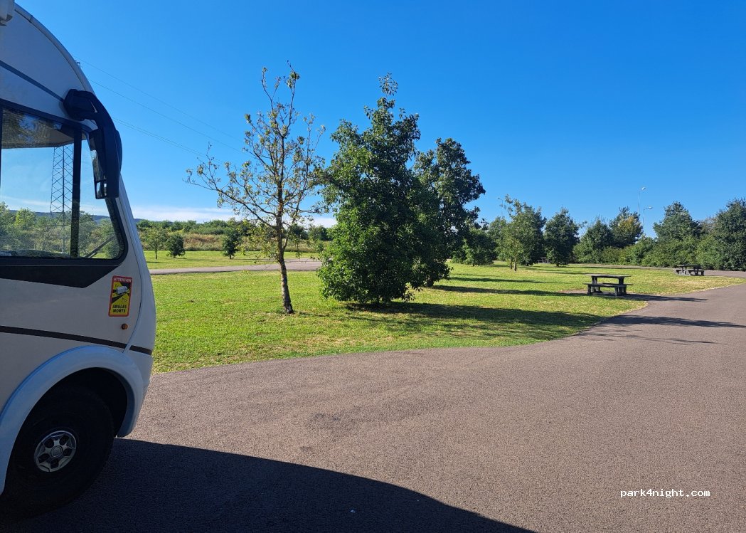 Bel espace vert réservé aux caravanes et camping car sur aire d autoroute pour faire une étape. A notre arrivée à 23h30 nous avons vu des dizaines de lièvres. des tables de pique nique et une grande poubelle sont à disposition. Tout le nécessaire sur l aire.