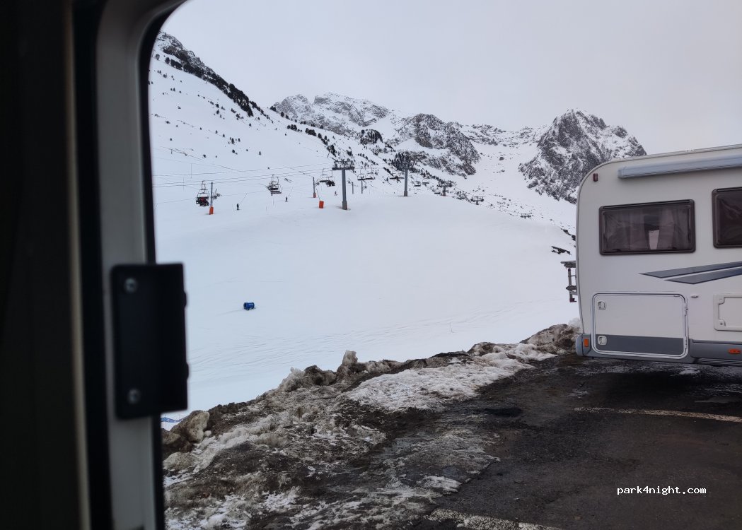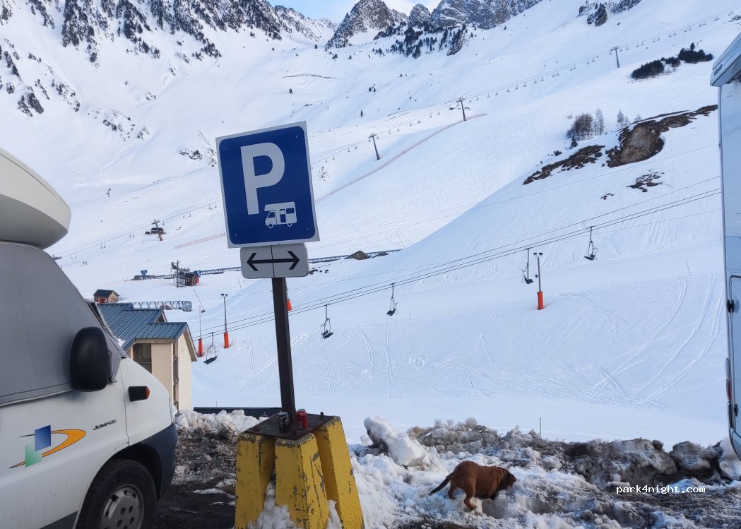 A la Mongie, Parking P4 en pente même avec les cales à se partager avec voitures. aucun service mais navettes gratuites de ce parking pour la station pied des pistes ou téléphérique pic du midi jusqu'à 22h45 le week end. Calme pour la nuit.