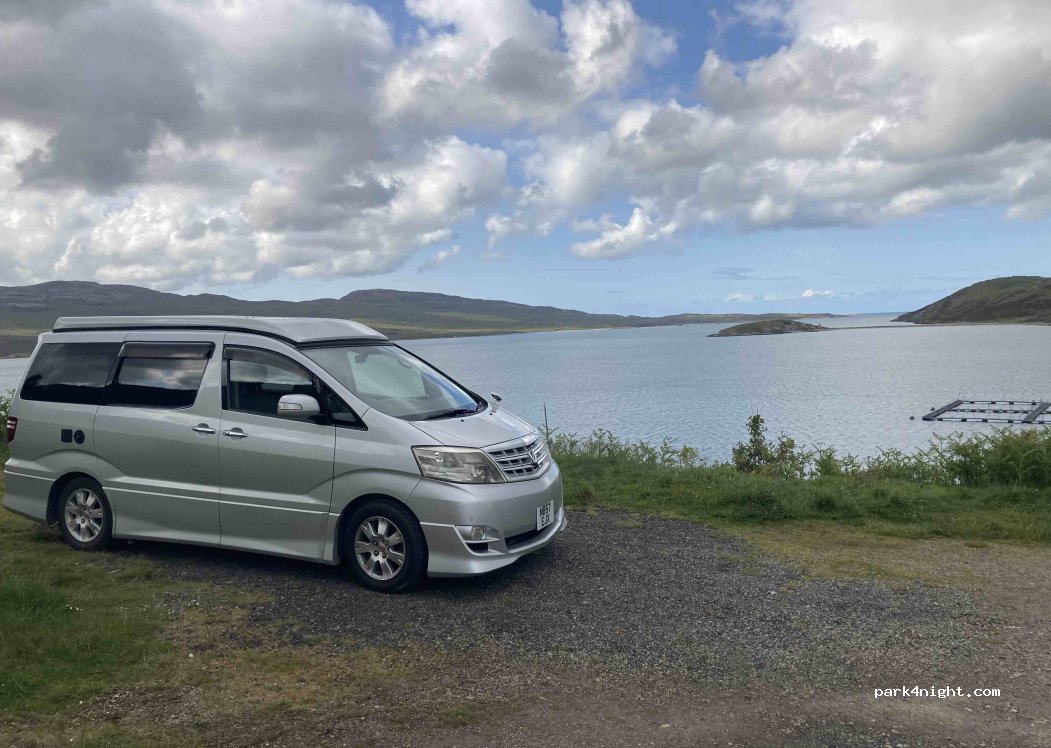 Wonderful spot. Bear in mind that it's an overpassing area but with an extended gravel landing, large enough for 3 motorhomes still allowing vehicles to overpass. We had a wonderful night there: lovely view and quiet road at night. Just been a bit annoyed by the midges but we stayed in our van and enjoyed the view in the evening and morning.