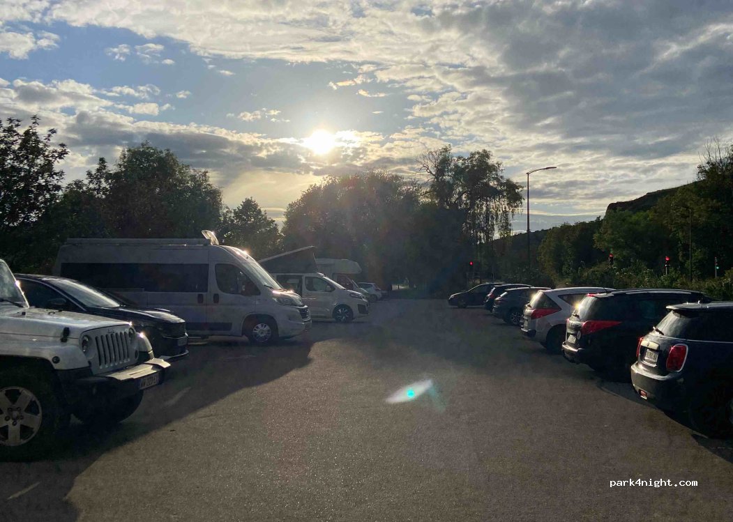 parking bien situé entre la route et le lac , avec beaucoup de places libres quand on arrive après 21h. pas trop bruyant pour un samedi soir , je m'y suis sentie en sécurité.
