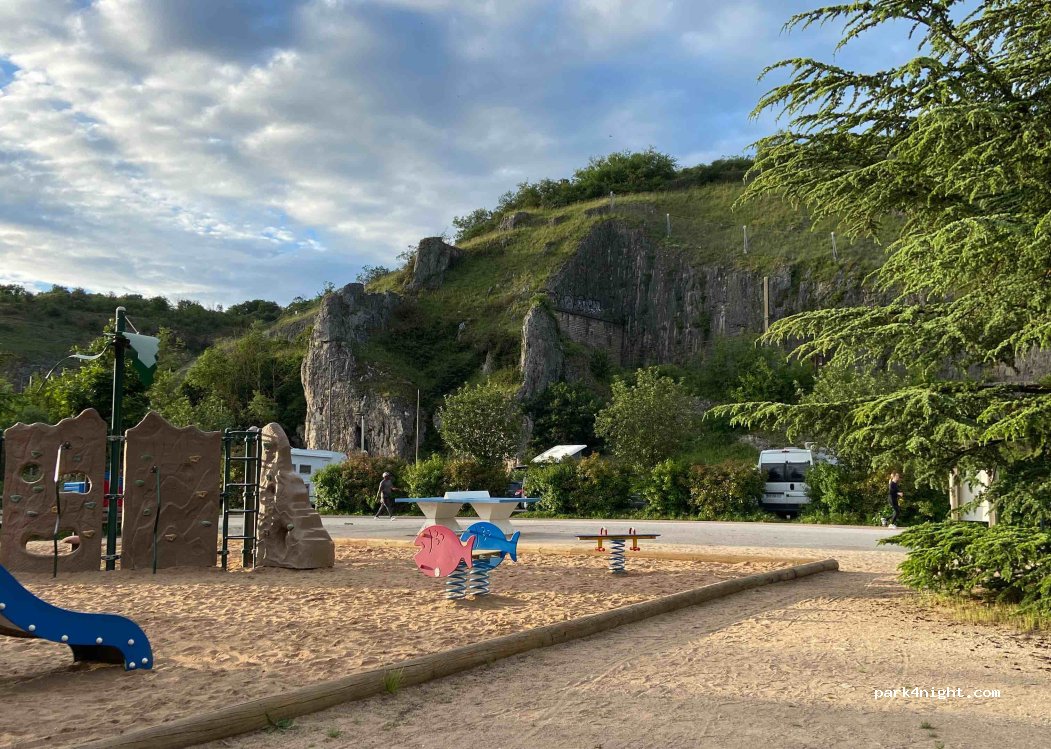 Nous y avons dormi en décembre. Nous étions deux sur le parking. A part du train, c’était plutôt calme. Idéal pour les enfants, avec un super aire de jeux au bord du lac.