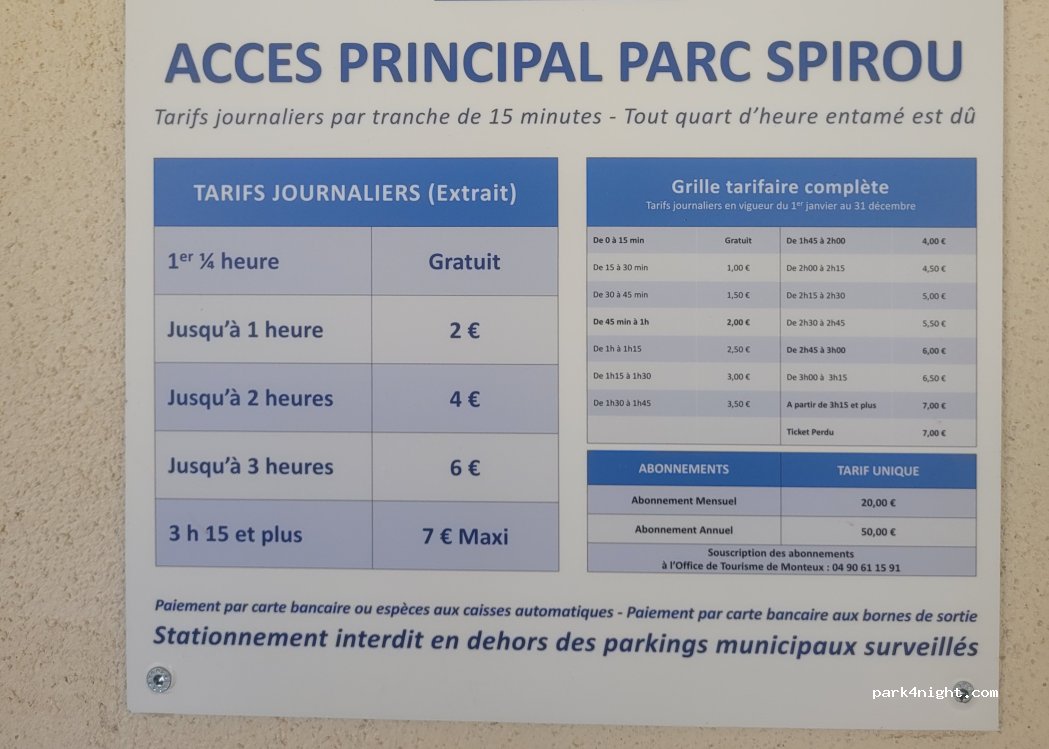 Parking bien aussi pour une halte d’une nuit Arrivée en fin d’après-midi pour un séjour d’une nuit et une journée entière pour 5 € il y aussi des toilettes publiques (pas de service) parking bien éclairé toute la nuit , accède par des barrières automatiques en prenant un ticket paiement au caisse à côté des toilettes ! 150 m pour arrivée à l’entrée du parc Spirou . Veronique et Michel