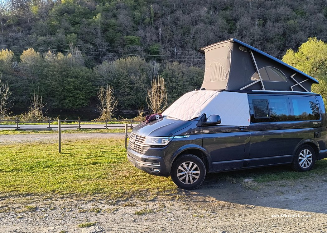 Je suis venue en semaine, parfait, beaucoup de places, je me suis garée sur le parking voiture vu qu'il était vide, la rivière juste en face, une petite plage d'herbe pour se baigner, des bancs , une brasserie juste à côtés , nuit calme sans passage