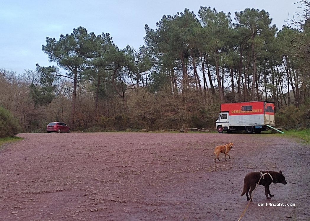 Parking non goudronné de départ pour randonnée pour la fontaine de barenthon ( à moins de 500m) avec circuit balisé dans la forêt de broceliande. Pas de limite de hauteur, place stable, sans pente. Hameau très calme à proximité. Nous avons passé une nuit très calme, seuls (peut être grâce au couvre feu ?). Peu voire pas de passage avant 10h 10h30 (en pleine semaine).