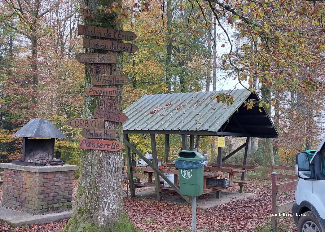 Top ! Super spot. Barbecue, bancs, tables, poubelles... il y a même un petit espace couvert (avec 4 bancs et 2 tables). Des petites traces de... sangliers.