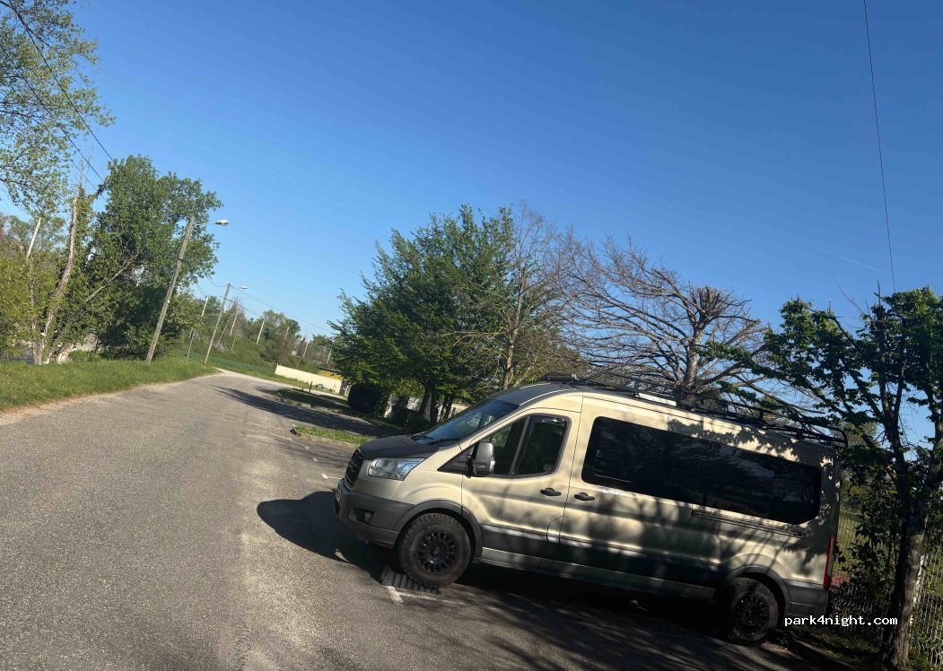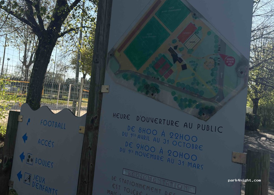 nous y avons passé une nuit avec un gros cc garé le log du grillage du terrain de foot. sous les arbres c'est plus des vans. les enfants ont adoré l'espace jeux et le pumptrack prévoir les casques. très calme la nuit