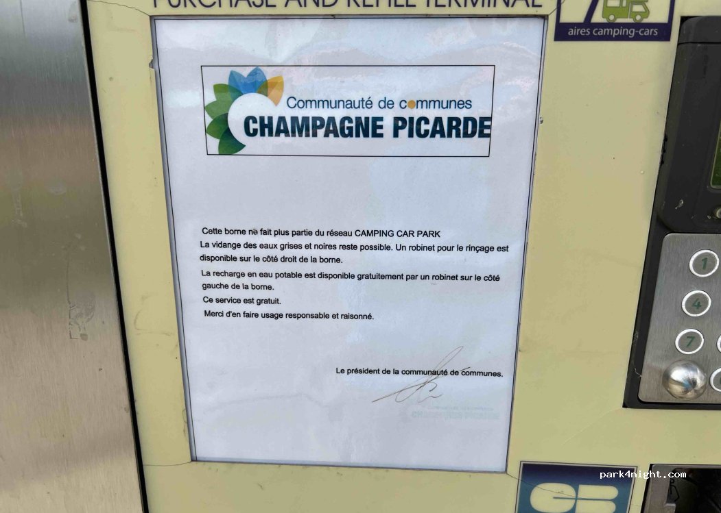 la borne camping car park ne fonctionne pas impossible de prendre de l'eau mais possible de faire les vidanges ...