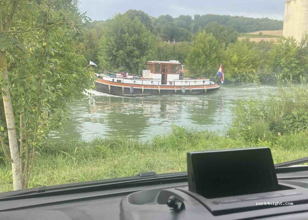 aire agréable devant le canal latéral de l Aisne où on voit passer juste devant nous des bateaux et des péniches services gratuits juste à côté