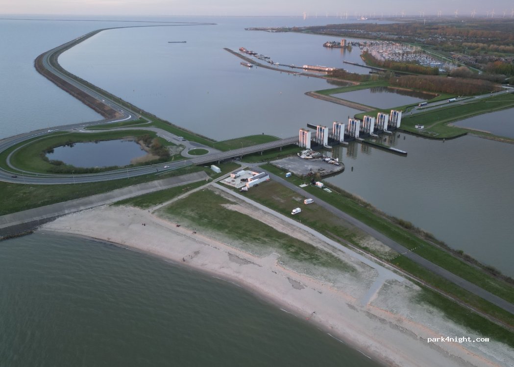 Schöner Blick auf Lelystad und das Isselmeer. Keine Toilette, aber dafür tagsüber Verpflegung durch Imbisswagen gewährleistet.