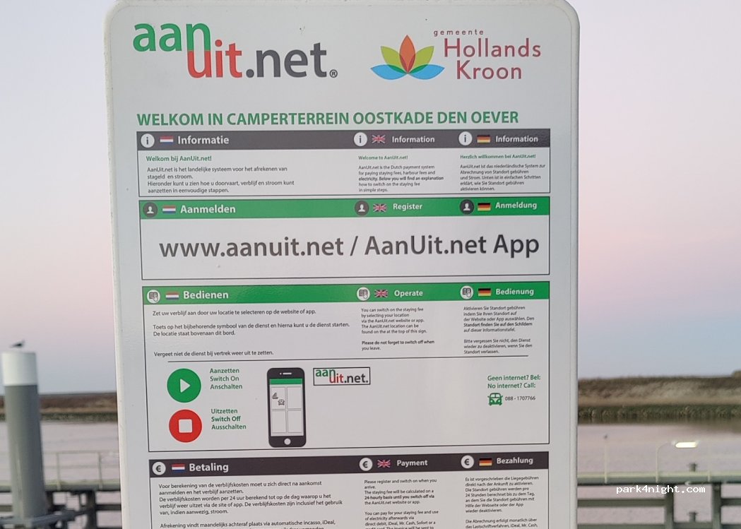Der Platz bietet zwar E-Anschluss, alles andere aber ist bei einem Preis von 14€ nicht enthalten. Zwar wird angegeben, dass es WC und Duschen hat, welche jedoch einige hundert Meter entfernt in der Straße "Havenkade" zu finden sind. Es keine Mülleimer. Bezahlen kann man nur, wie leider schon häufiger erlebt, über "Aanuit.com", die bei Beschwerden ein anderes Bezahlsystem aktivieren...