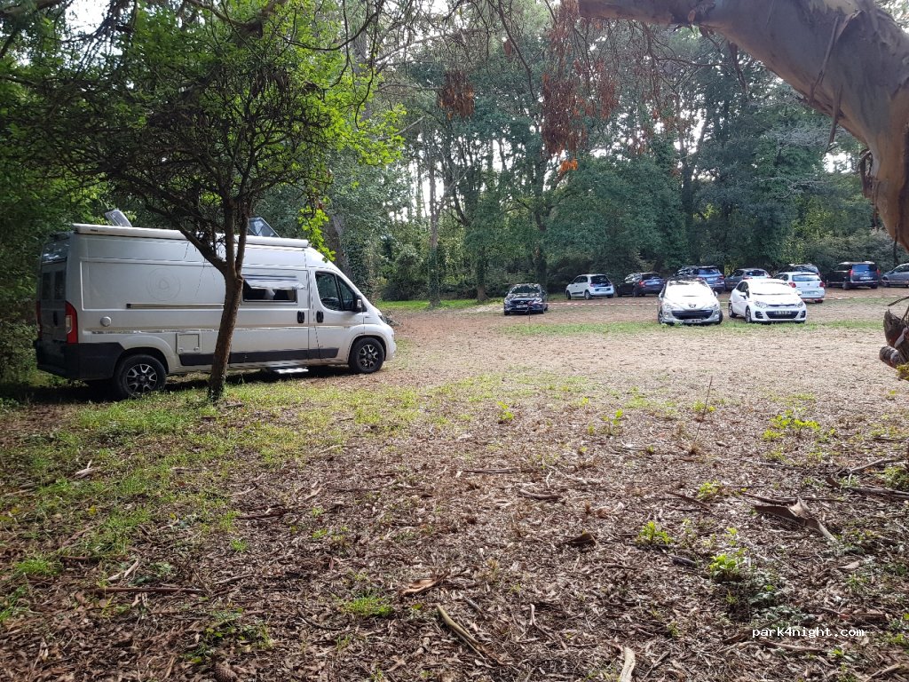 Nous venons de passer 2 nuits sur ce parking qui est idéal, sous les pins à l'abri du vent de la côte. c'est à peu près plat, pas de toilettes à proximité mais facile de trouver des coins calmes. nous sommes en van et la hauteur est limité à 2m10.