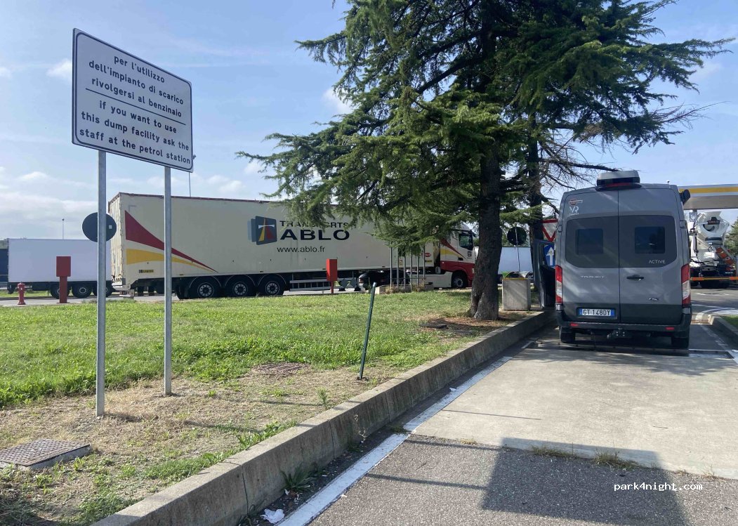 Aire de repos en direction de Milan avec services gratuits avant le ravitaillement.