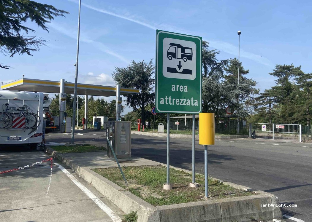 Área de descanso dirección Milano con servicios gratuitos previo repostaje de combustible.