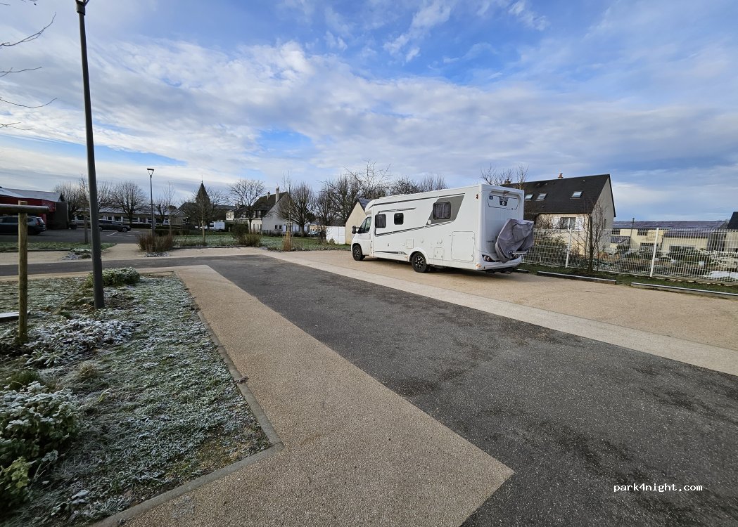 Très très calme pour les vacances scolaires, avons dormi entre le cimetière et le groupe scolaire, seul. Pain frais le matin car boulangerie à côté.