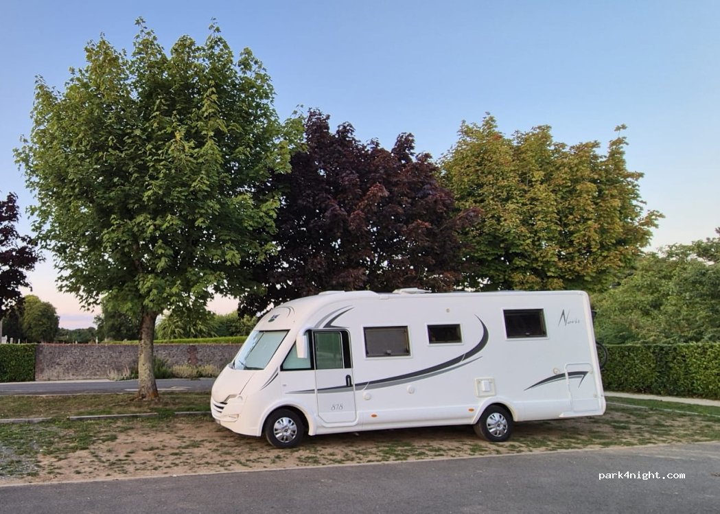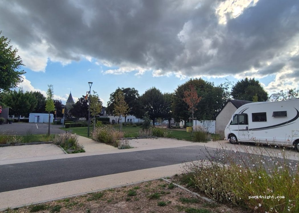 We enjoyed a lovely quiet night. The site has been changed since the original picture so I’ve posted an up to date one. There is space for 3 or 4 motorhomes and even more camper vans. The site is gently sloping. There are no services on site. Neighbours are friendly. Boulangerie and bar less than 100 metres. No noise or complaints from the residents of the graveyard. Thank you to the town.