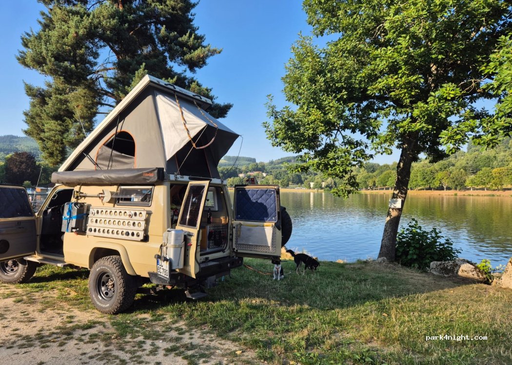 Au bord du lac, calme et très sympa. Il faut monter une petite route d’accès a la station de vidange pour ccars 150 m au dessus du parking. Terrain plat, toilettes publiques impeccable. excellent lieu pour faire étape mais difficile d'accès depuis la sortie autoroute à Thiers