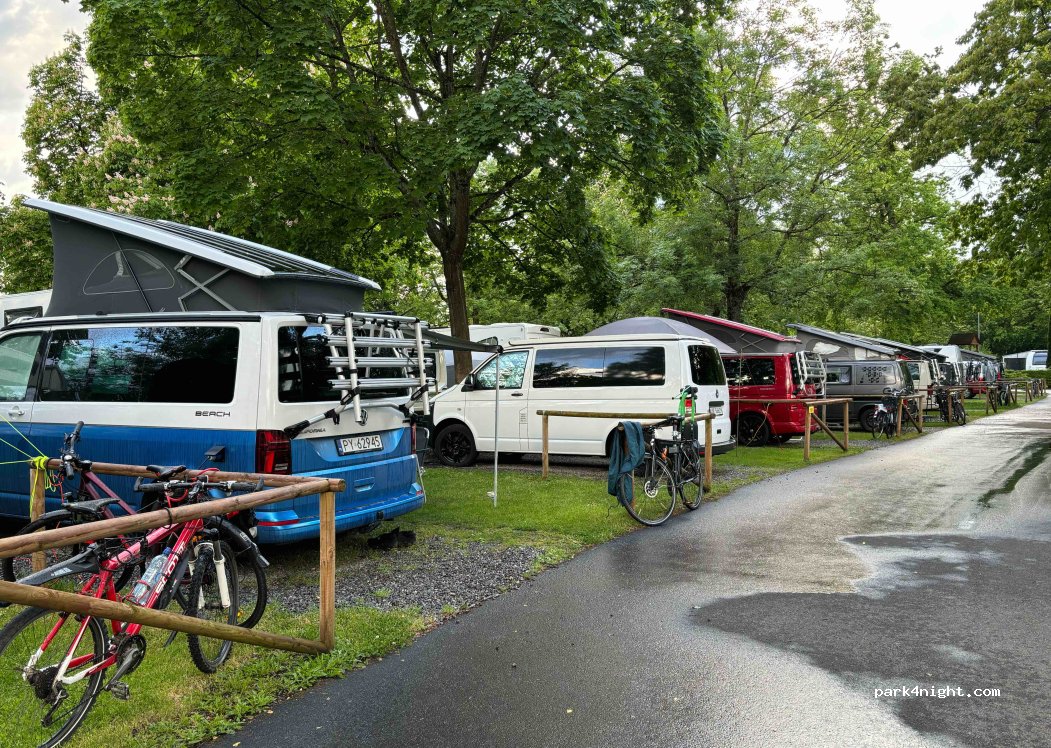 Grand camping, accueil agréable et parle français, simple emplacements sur gravier et sous les tilleuls beaucoup trop cher pour une nuit par le temps de profiter des services, 46 € un camping-car et 2 personnes, prix pas justifié