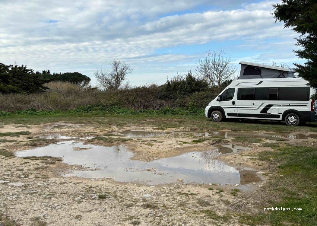 Un excellent spot accessible à tout camping car. Le terrain n'est pas très grand mais convient pour 1 ou 2 véhicules aménagés de jour, en laissant de la place aux autres berlines qui viennent régulièrement durant la journée. Sol argileux, parfois cabossé, on peut quand même stationner à plat facilement. Peut être le point de départ pour la visite à pied de St Martin de Ré par la piste cyclable...