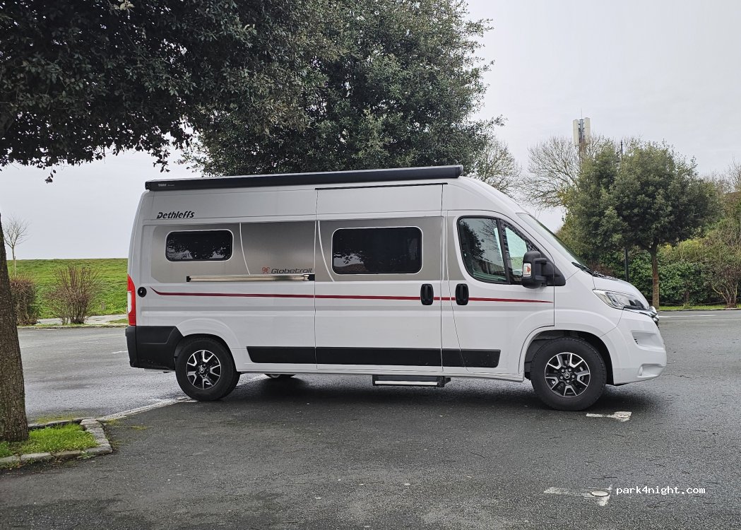 Bon parking de jour à proximité immédiate du port et sans limitation de hauteur. Les places sont quand même pas très grandes, plus adaptées aux fourgons qu’aux grands CC.