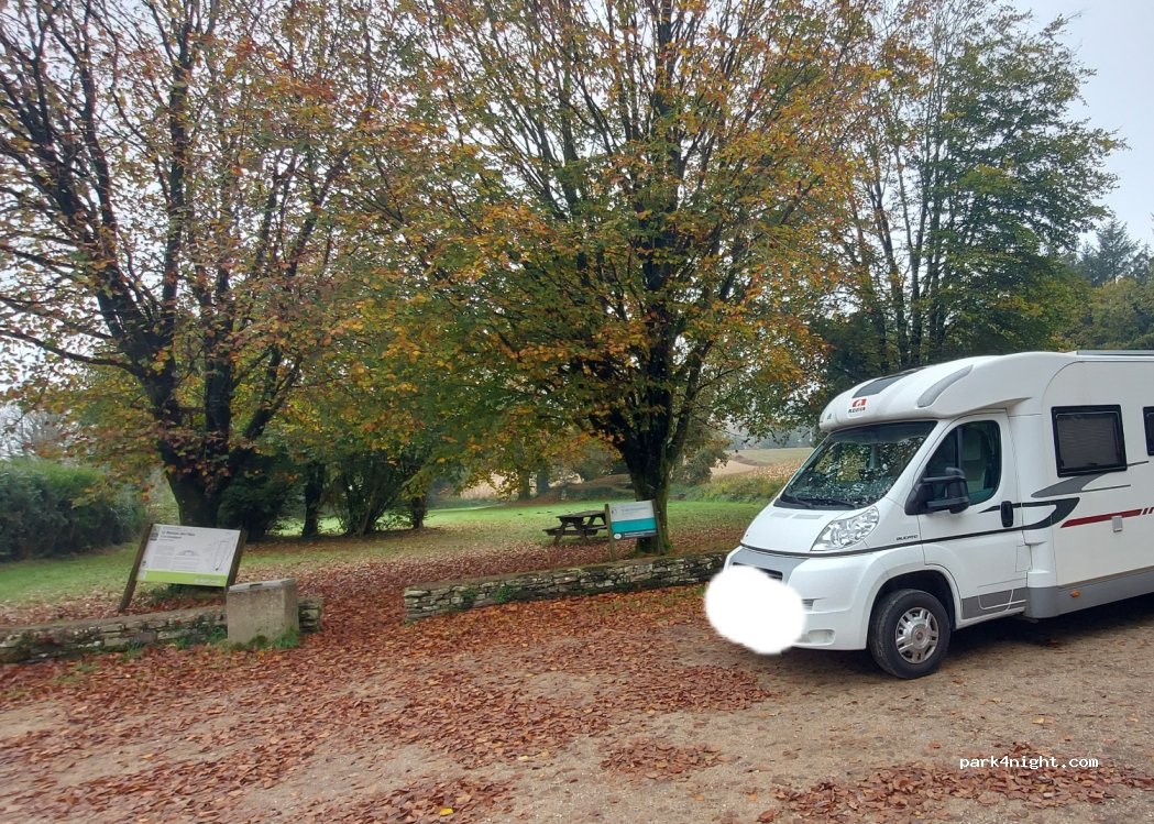petit parking très intime à la sortie du village de Brennilis . Une table de pique-nique et un dolmen espace naturel protégé . Nous sommes dans " la maison des fées" . Aucun panneau pour interdire le stationnement de nuit . Il y a une poubelle.