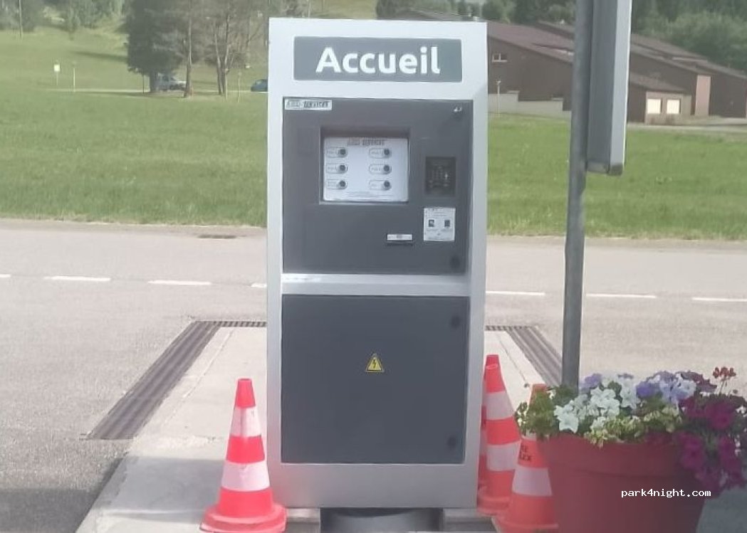 Next to the municipal tennis courts and public restrooms, parking area and service terminal are open year-round. Three electrical outlets are located on the main terminal, and four on the annex terminal. Payment is by credit card for all outlets on the main terminal. Quiet pitches with all amenities: water, electricity, and waste disposal. Magnificent view. Thanks to the municipality of Lelex. Service prices vary depending on the season. Snow removal is carried out in case of snow; in winter, please follow the parking plan.