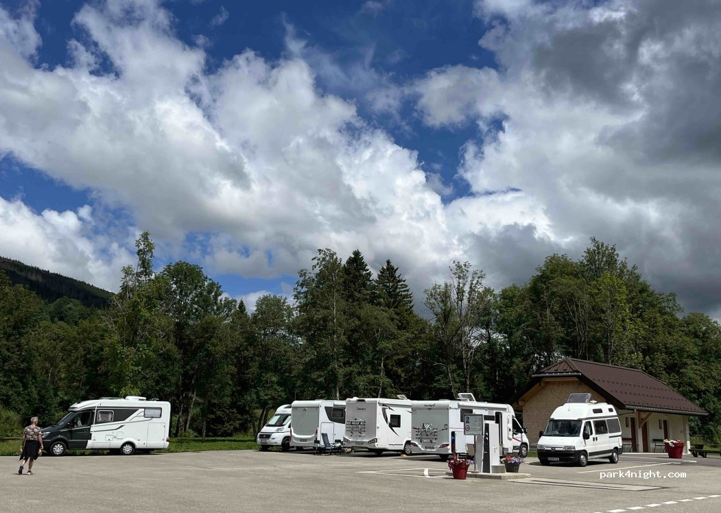 Parking bitume, plat, places larges, environnement de moyenne montagnes et belles randonnées à proximité. Top merci à la commune. Les services fonctionnent sur la borne tote neuve.